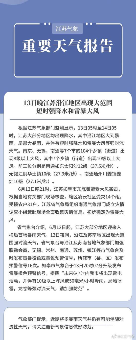 根据江苏气象部门监测显示,13日05时至14日05时,江苏大部分地区均出现降水,其中沿江地区大到暴雨,局部大暴雨,并伴有短时强降水和雷暴大风等强对流天气。南京、无锡、南通等7个市的104个乡镇(街道)出现8级以上大风,其中7个乡镇(街道)出现10级以上大风。前三位分别是南通如东太阳沙12级(37.5米/秒)、无锡江阴华士镇10级(27.9米/秒)、南通通州川姜镇姜灶10级(27.1米/秒)。