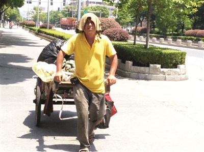 “这车上是从茶南一带小区捡来的废品,卖不到几个钱,可以赚一二十元。”龚建胜说,这几年他和老乡们都在南京靠捡废品为生。“最近天热,太辛苦了,尤其是在工地上拆墙抡大锤捡钢筋时,真是挥汗如雨。不少干我们这一行的人吃不消,都不干了。”人们不喜欢大热天,龚建胜却很开心。“冒着高温多跑一个小区就能多赚点钱。”他一边说,一边起身拉着板车继续前进。