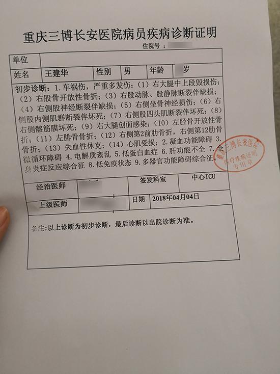 伤者王建华治疗费用将不菲。 王建华家属供图伤者王建华女儿王娟告诉澎湃新闻,该事故中4名伤者中,父亲王建华伤情最严重,已接受截肢手术,现仍在重症监护室救治。重庆三博长安医院4月4日出具了对王建华的疾病诊断证明,该证明显示,初步诊断其共有4大类病情,包括多处开放性骨折、失血性休克、凝血功能障碍、多器官功能障碍以及全身炎症反应综合征等。此前,重庆三博长安医院中心ICU于4月9日根据王当时病情及家属希望“保肢”的要求,预估住院费用为80万元。