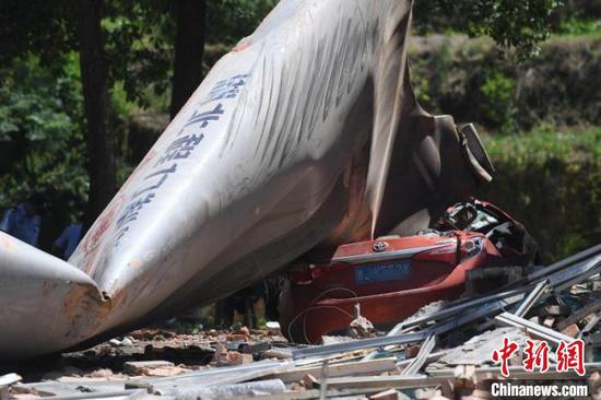 被炸飞的槽罐压在小汽车上 6月14日G15沈海高速公路温岭大溪段槽罐车爆炸事故现场航拍据通报,现场大规模搜救工作已基本结束,后续搜救及各项善后工作正在有序进行中。