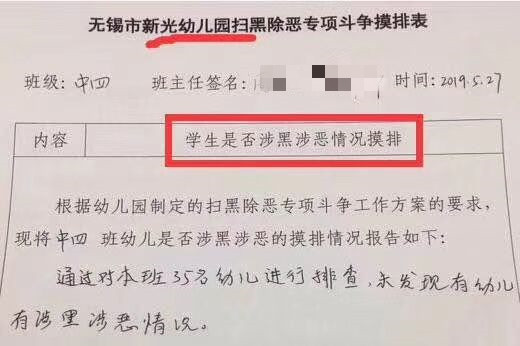 5月28日,一张《无锡市新光幼儿园扫黑除恶专项斗争摸排表》的图片在网络热传,图中表格汇报栏写道:“通过对本班35名幼儿进行排查,未发现幼儿有涉黑涉恶情况。”表格抬头,还附有两名班主任老师的签名。该图片被网友纷纷转发,引起广泛质疑。