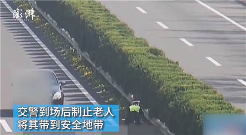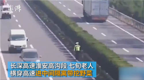 近日,江苏淮安。一年近70岁的老人和一女子进入高速路隔离带,俯身挖野菜。执勤交警横穿车流上前劝阻,2人分别返回路边。民警得知2人均为附近村民,欲采野菜食用。