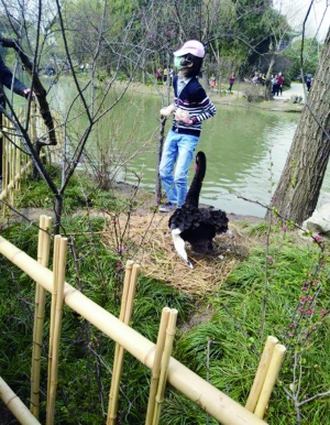 3月4日中午12点半左右,有网友发微博爆料:扬州瘦西湖风景区九曲桥桥南的草坪上,一名男游客突然越过保护黑天鹅的护栏,将天鹅蛋踩碎,“天鹅护蛋,他竟然把天鹅翅膀打出血来,两只黑天鹅不肯离去,其中一只对天哀嚎。”