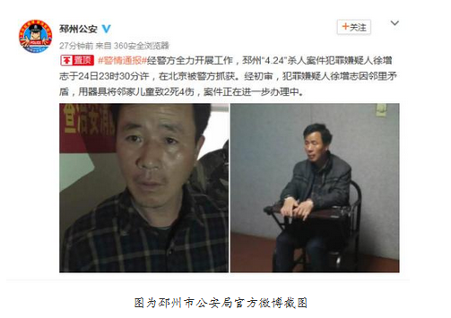 据江苏省邳州市公安局官方微博发布的消息,经警方全力开展工作,邳州“4.24”杀人案件犯罪嫌疑人徐增志于24日23时30分许,在北京被警方抓获。经初审,犯罪嫌疑人徐增志因邻里矛盾,用器具将邻家儿童致2死4伤,案件正在进一步办理中。