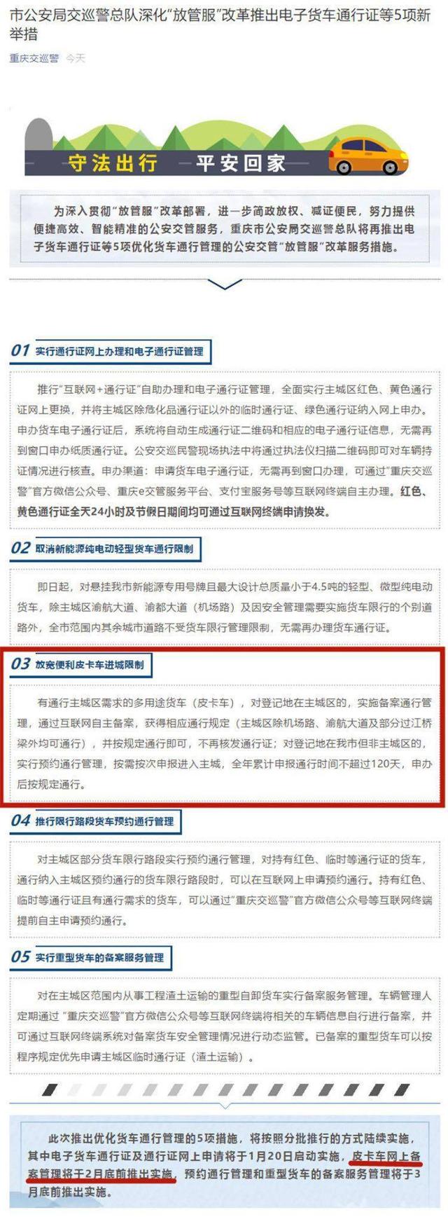 1月15日,重庆市公安局交巡警总队发布了关于放开皮卡进城限制的通告,即日起,凡经过备案或预约管理的皮卡车,可在主城区除机场路、渝航大道及部分过江桥梁外按规定通行,不再核发通行证。无独有偶,16日下午宁波市公安交通警察局也宣布,从2月1日起,放宽当地号牌皮卡在中心城区的通行限制。