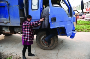 午后的乡间水泥路上,一辆蓝色的农用卡车驶来。伴随着一阵“嗡嗡”声,卡车停了下来,驾驶室内走出一名女子。她皮肤黝黑,身材不高,站在这辆“大家伙”面前,显得很弱小。这名女子手里拿着扳手,走到驾驶室的另一侧,熟门熟路地将扳手卡在前轮上。车门打开了,一名男子探身下车。这名男子看起来三十多岁,袖管却空荡荡的,这让他下车时会有些困难。女子躬身上前扶住男子,而男子则踩在这把扳手上,一步一步挪下车。