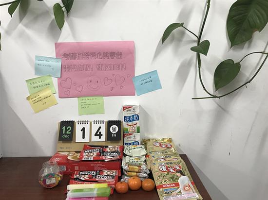 记者注意到,与其他考研自习室一样,这间教室的桌上堆满各类备考书籍,但靠门而设的一个特殊“共享台”却十分引人注目。精致的纸盒里,有各类考研党的必备“武器”——取暖的暖宝宝、提神的咖啡条、充饥的零食等等。据了解,这个“考研物资共享台”是自习室内的同学们自发组织设置的。他们平时专心学习,彼此间交流不算多,开始不知哪位同学在空桌上留了一盒咖啡,并贴上了“研友共享咖啡条,需要自取”的小纸条。从那以后,这个桌面就没再空下来过。从咖啡条、小零食到不同颜色的替芯和便利贴,同学们总能在这个位置及时找到自己急需的东西,也时常在这上面添些新的东西。入冬以来还有细心的女同学带来了暖身贴。“几个月来,这已经成为了我们心照不宣的习惯了,算是研友间的相互鼓励吧。”王薇同学笑道。