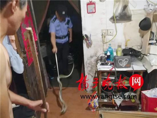 17日凌晨3时许,高邮老电厂一出租屋内突然闯入一名“不速之客”。“客人”身长1.5米左右,身体有小孩手腕粗,还不停地吐信子,发出“嘶嘶”声。原来,这是一条大菜花蛇,它的到来把住户吓坏了。民警接到报警后赶到现场,发现此蛇无毒,由经验丰富的民警将其抓获,随后将其带到无人的郊外放生。