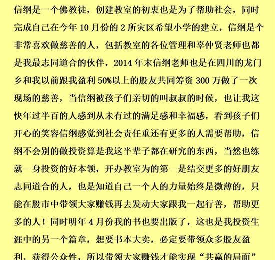 “信纲老师”自称是佛教徒根据信纲老师前期的自我铺垫,在投资界纵横多年的他早已赚得盆满钵满。由于虔诚信仰佛教,他近年来的工作重心已经放在写书、讲课等文化传播事业上,并有意将几十年的投资经验普度给更多的赔钱股民,条件是等大家在市场上赚了钱,一定要拿出至少5%来捐给慈善事业。“他在直播间上课的时候就反复强调做慈善”,姜川补充道。