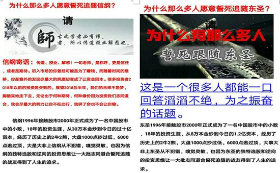 渐渐的,信纲老师以方便时间冲突的学员听课为由,把课程表安排得越来越满,授课团伙里每天会派出3-4名老师轮流讲课。上午、下午、晚间,除去吃饭时间,都有老师在讲,各有各的见解。据姜川描述,课程的资料每天都会发到手机里,平均一天有5份资料,要求学员反复领会。上课的时候老师还透露出,除常规资料以外还有更加珍贵的机密资料,要再拉几位朋友一起来听课才能获得。
