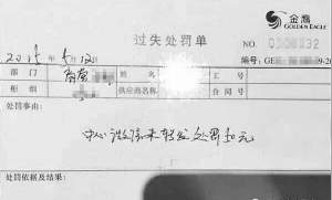 现代快报记者在陈芳提供的罚款单据上注意到,单据名称为“过失处罚单”,罚款事由是:中心微信未转发处罚50元。“凭什么罚款,罚的钱都去了哪里?又不是正规的单据。”陈芳说,大家都是敢怒不敢言。