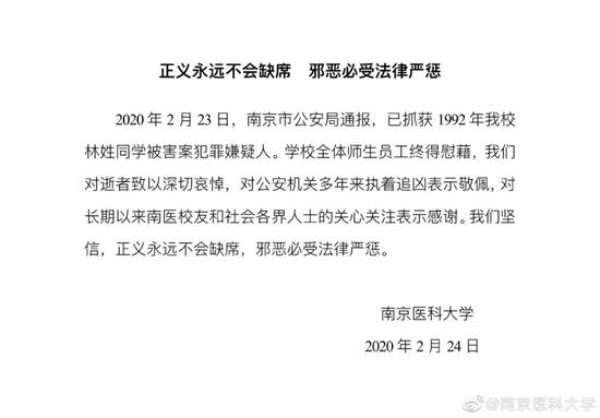24日12时,南京医科大学官方微博发布通报称,正义永远不会缺席,邪恶必受法律严惩。23日,警方抓获该校林姓同学1992年被害案的犯罪嫌疑人。学校全体师生员工终得慰藉,我们对逝者致以深切哀悼,对公安机关多年来执着追凶表示敬佩,对长期以来南医校友和社会各界人士的关心关注表示感谢。