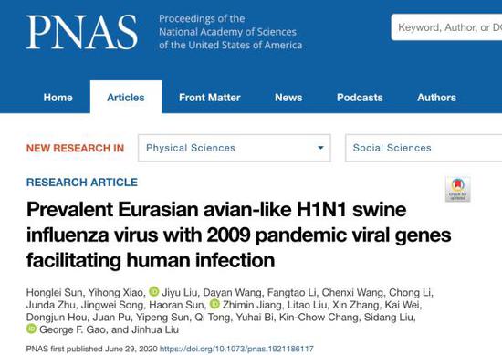 以上发现来自当地时间6月29日国际权威期刊《美国科学院院报》(PNAS)的最新论文“Prevalent Eurasian avian-like H1N1 swine influenza virus with 2009 pandemic viral genes facilitating human infection”。论文通讯作者为中国农业大学动物医学院刘金华教授和中疾控主任高福院士,第一作者为中国农业大学动物医学院预防兽医学系副研究员孙洪磊。