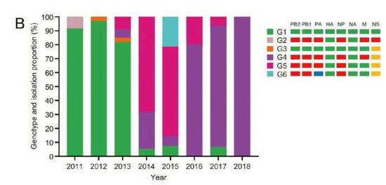 猪鼻拭子分析结果表明:G4病毒在2013年便已出现,在2016年开始成为主流,并在2018年占了绝对多数。