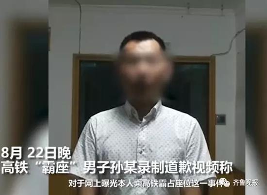 “霸座”男子孙先生在道歉视频中表示:对于网上曝光本人乘高铁霸占座位这一事件,我深表悔恨和自责,在此,我向当事人和全国人民表示诚挚道歉,我深刻反思,我的这种行为严重违反了社会公德,对当事人造成了极大伤害,对社会造成了恶劣影响,痛定思痛,我保证在今后不再犯此类错误,一定加强个人修养,提高个人素质,也恳请全国人民给我一次改过自新的机会。