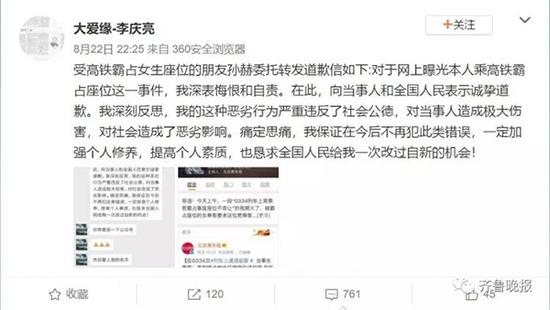 同时,微博网友“大爱缘-李庆亮”称,孙先生还委托他在微博上表达歉意:
