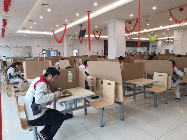 中午就餐时,采用了轮流就餐、分散就餐的制度。这样一来,往日熙熙攘攘的食堂一下子变成了大型考试现场,餐桌之间用纸壳隔离,防止考生们“交头接耳”,最大限度维持不戴口罩时段的防护。