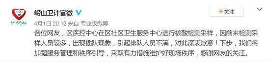 此前,青岛市崂山区卫生局官方微博曾发布消息称,崂山区疾控中心在区社区卫生服务中心进行核酸检测采样,因前来检测采样人员较多,出现插队现象,引起排队人员不满,对此深表歉意!下步,将加强服务管理和秩序引导,采取有力措施维护好现场秩序。
