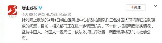 中新网4月2日电 据青岛市崂山区人民政府新闻办公室官方微博消息,针对网上反映的4月1日崂山区疾控中心核酸检测采样三名外国人现场存在插队现象的问题,目前,相关部门正在进一步调查核实。下一步,根据调查核实情况,坚持中国人、外国人一视同仁,依法依规进行处置,调查结果将及时向社会公布。