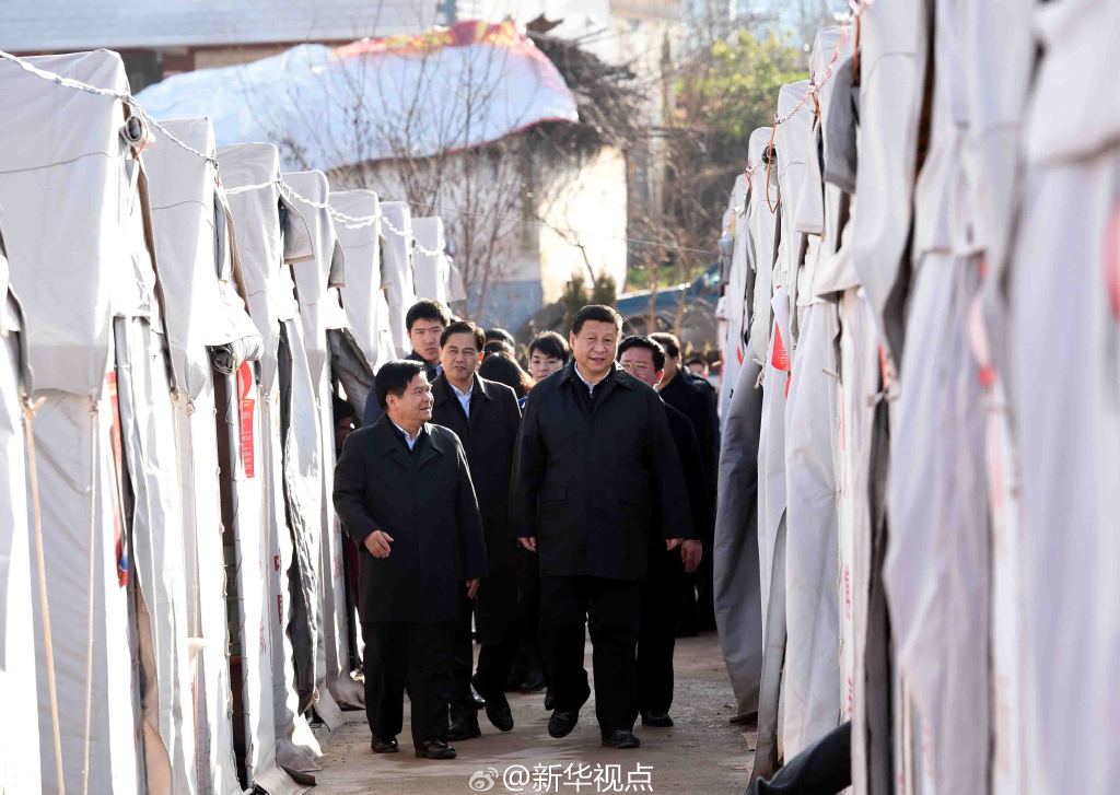 习近平来到小寨镇甘家寨红旗社区过渡安置点,走进邹体富老俩口和孙子住的帐篷,吃饭、补助、新房规划、收入来源……他问得十分仔细。总书记摸了摸棉被:“暖和不暖和?”又指着帐篷问:“都加厚了?”干部说,灾区群众都配了棉帐篷、棉被和电热毯。