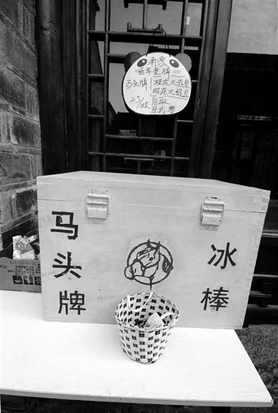 更让人没想到的是,这样一个大木箱不仅真有冰棒出售,而且还没有老板经营。“马头牌桂花大赤豆、桂花大绿豆,2.5元/根,自取自找零。”别具一格的经营方式让经营者也显得格外任性。下午3点多钟,当记者终于在老门东找到原样时,打开木箱,厚厚的白褥下还存着十多根冰棒,不时有路人侧目打量。一对年轻夫妇推着婴儿车路过,好奇的先生终于没忍住掏钱自取了一根,同时自觉地在敞开的零钱篮里找了5毛钱。