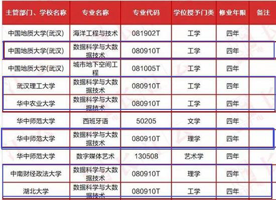 (部分新开设“数据科学与大数据技术”的武汉高校)2016年2月,教育部公布新增“数据科学与大数据技术”专业,北京大学、对外经济贸易大学、中南大学成为首批获批高校。次年,又有32所高校获批。此次248所高校获批“数据科学与大数据技术”专业,几乎是前两次获批高校的8倍。