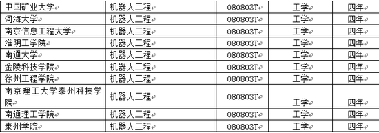 (新设立“机器人工程“专业的江苏高校)2017年,教育部公布2016年度高校本科专业备案和审批结果,获批“机器人工程”专业的高校增至24所,今年这一数据达到60所。