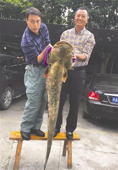 两男子周旋2小时钓起巨型鲶鱼 长达1.7米重86斤(图)