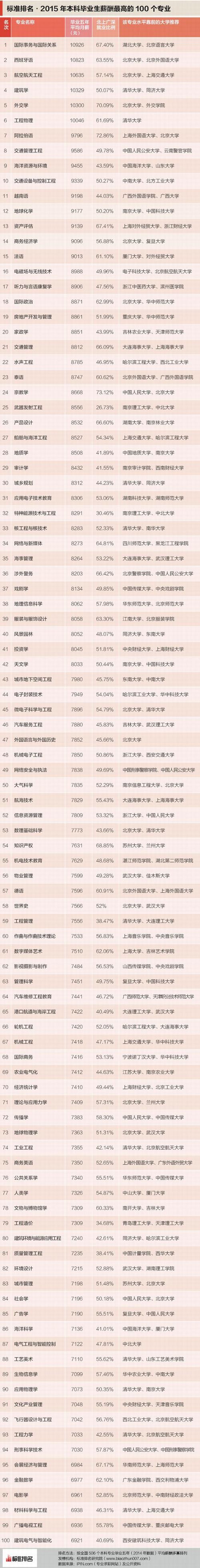读什么专业,毕业后能拿到高薪?标准排名研究院基于国内高校506个本科专业的就业数据,制作了《2015本科专业毕业生薪酬排行榜》,找出了本科毕业生薪水最高的100个专业,我们一起来看看。 综合人民日报官方微信